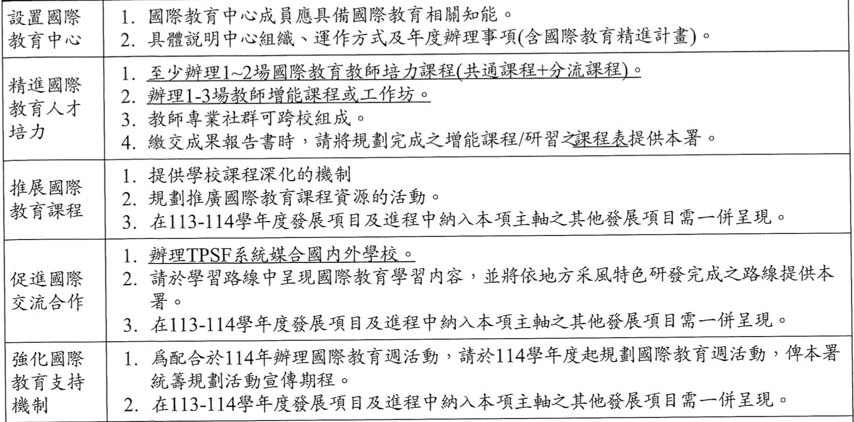| 強化國際教育支持禨制 | 1. 為配合於114年辦理國際教育週活動,請於114學年度起規劃國際教育週活動,俾本署統籌規劃活動宣傳期程。 2. 在113-114學年度發展項目及進程中納入本項主軸之其他發展項目需一併呈現。 |